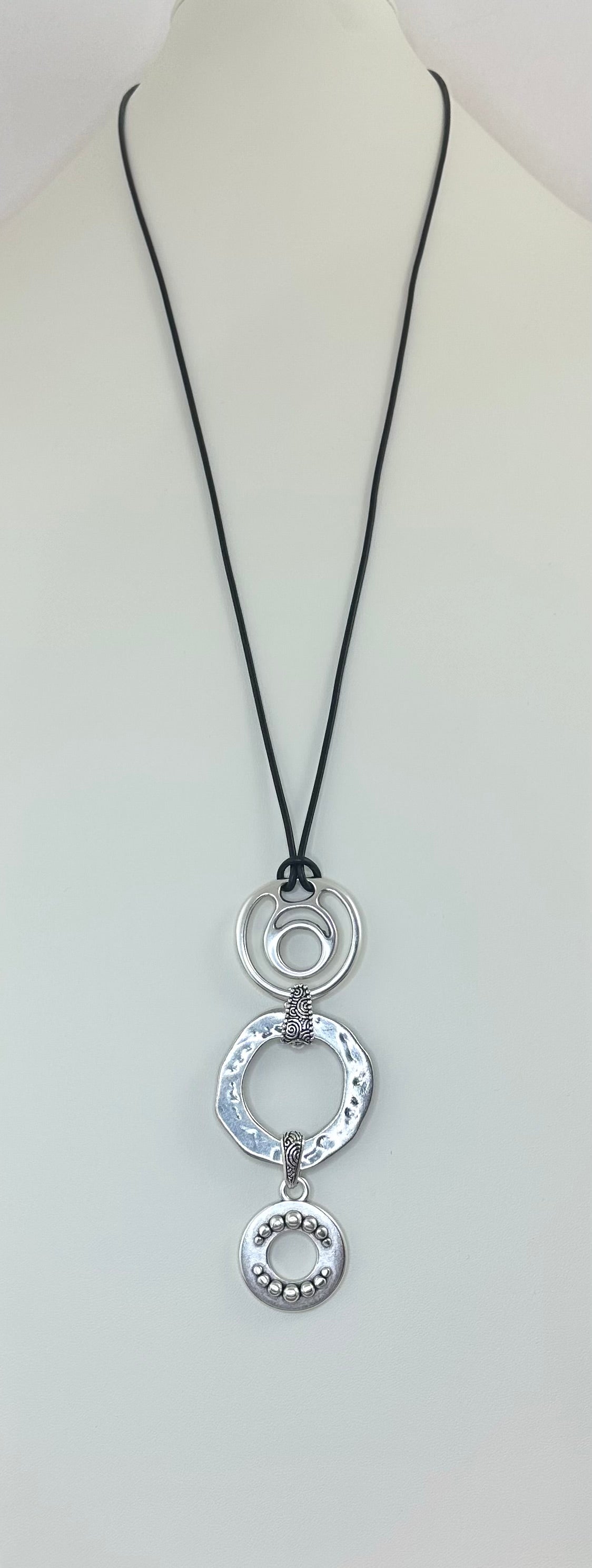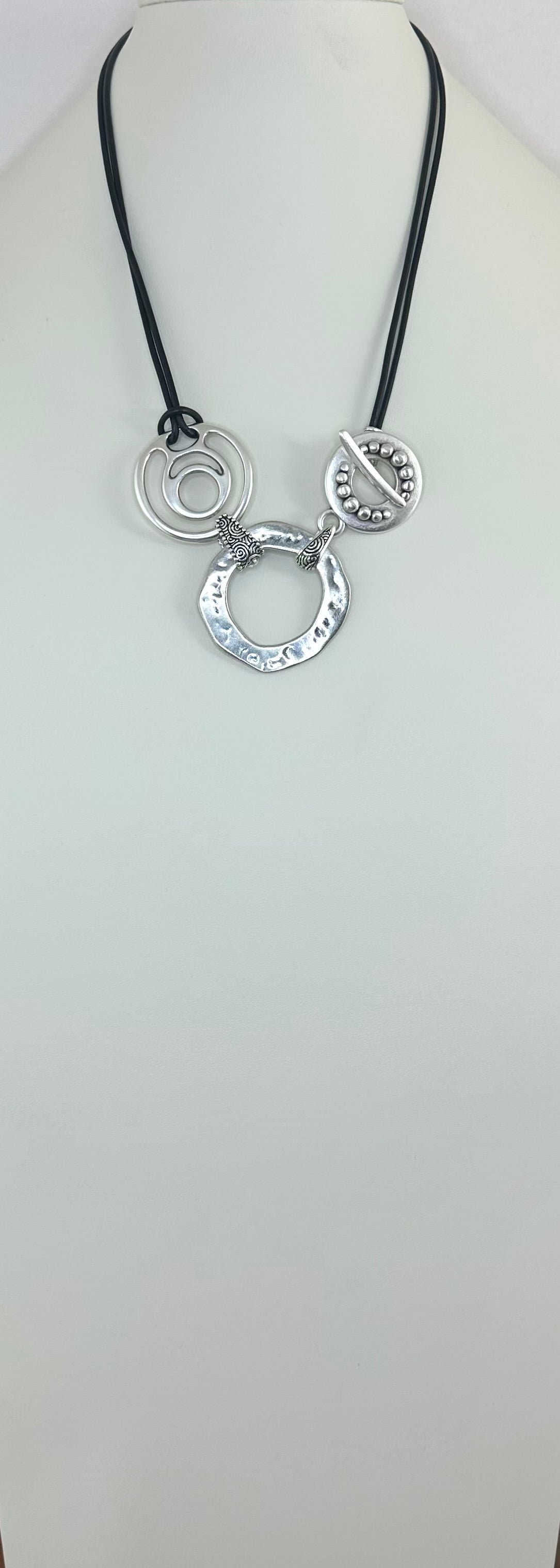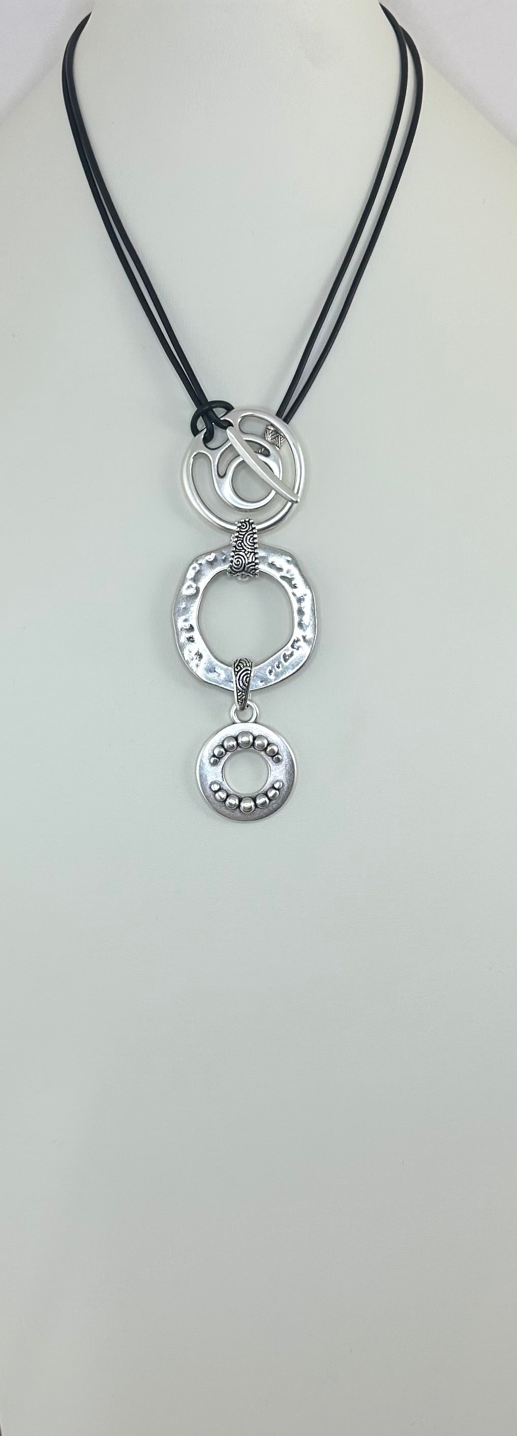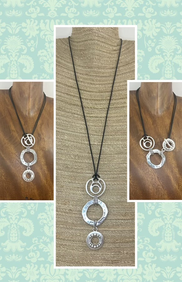 Open cord out to wear long, or double the cord and place the toggle bar through either small circle. Images show the different ways to wear.