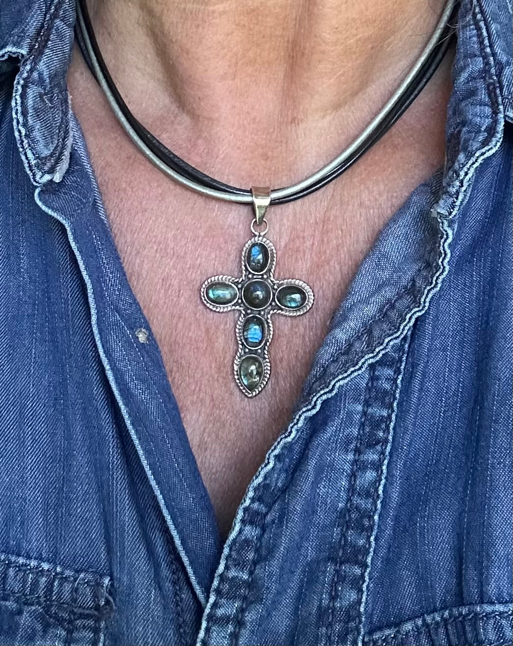 • Nice size cross with 6 little iridescent labradorites, set in sterling silver with rope edging